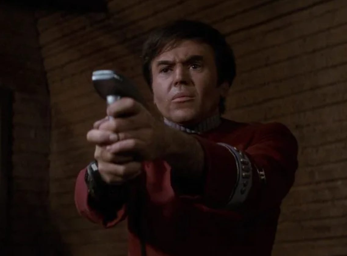 Poor Chekov (Walter Koenig). He did some bad things while his cerebral cortex was compromised by Khan’s alien critter. His brain was eventually liberated, but he certainly needed some therapy.